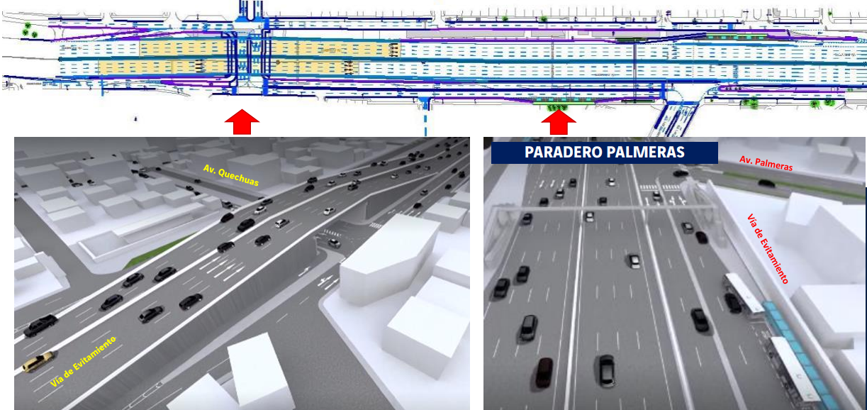 • El proyecto propone la creación del viaducto Quechuas que ayudará a mejorar la fluidez en el tramo entre Av. Quechuas y Av. Palmeras. Asimismo, se eliminará el semáforo.