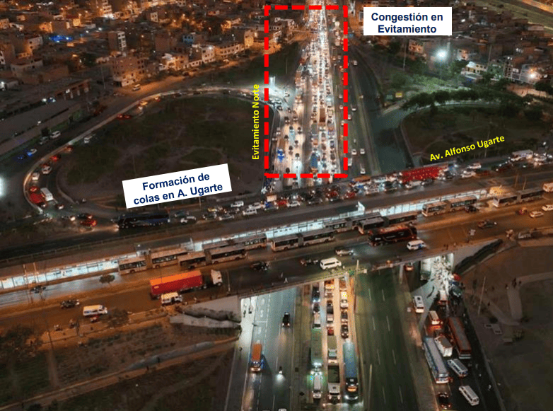 - En horarios de mayor demanda, se evidencia una falta de capacidad del paradero para albergar personas y buses de transporte público, generando la obstrucción de la vía auxiliar y principal de la Vía de Evitamiento.